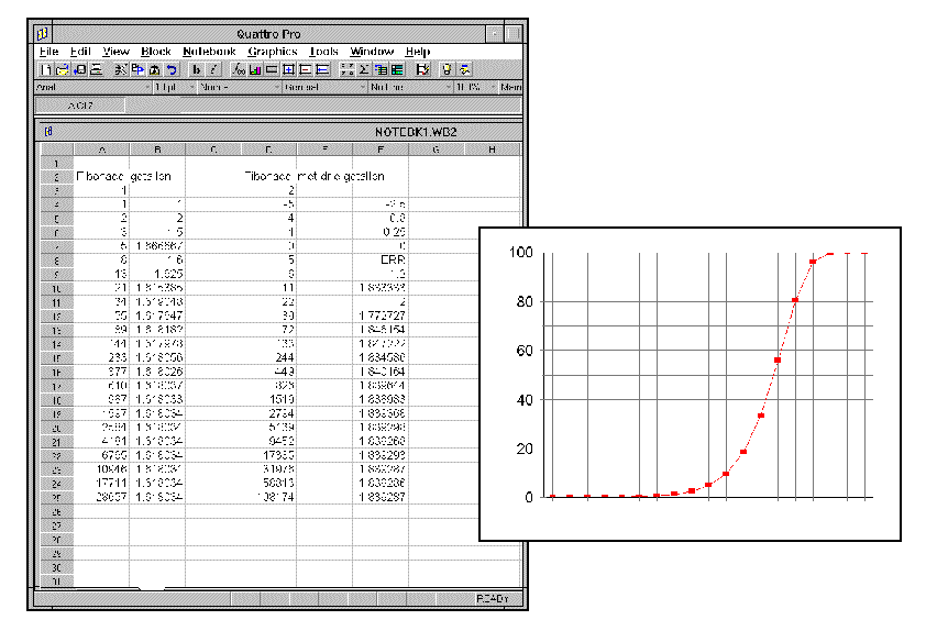 Fibonacci-getallen gaan heel eenvoudig. Probeer ook eens wat gebeurt als je anders begint, of de regels verandert, bijvoorbeeld: drie opeenvolgende optellen.