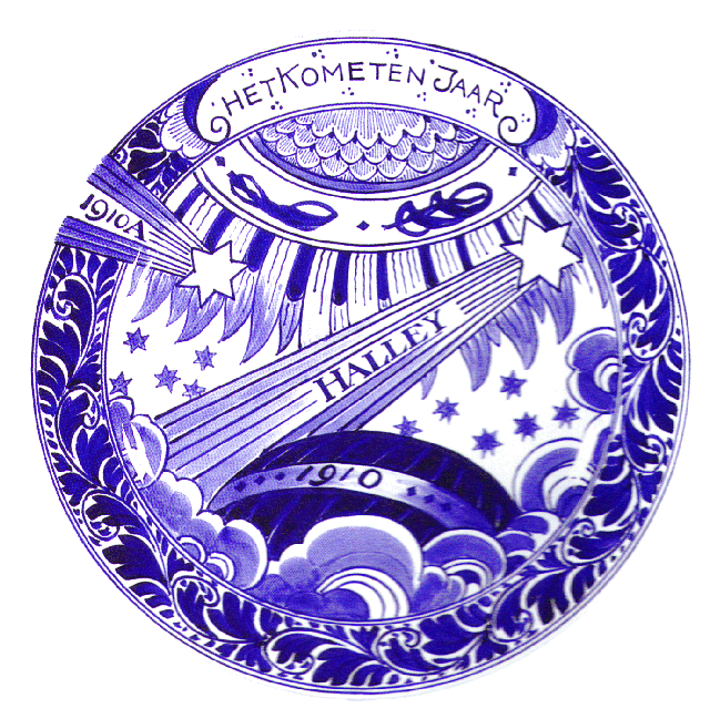 Cometary depictions on porcelain, however, seem to be relatively rare. In fact, I know only of one example of this kind of depictions, namely a series of blue Royal Delft plates issued in 1910 by the porcelain manufacturer ‘De Porceleyne Fles’ in Delft commemorating the return of Halley’s Comet in that year.