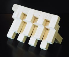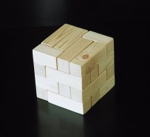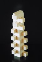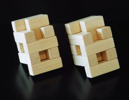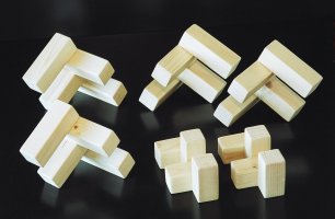 A puzzle with six pieces that form a block, or many other shapes. Pictures are shown of an aluminum version and a wooden version; they are the same puzzle.