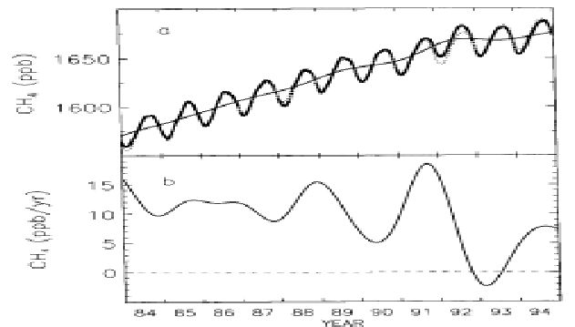 Figure d: Global average methane concentration (a, parts per billion) and the rate of change (b, parts per billion per year) from 19984 to 1994. The decreased growth rate after 1991 is generally attributed to the eruption of Mt. Pinatubo. This eruption might have influenced tropospheric OH concentrations (e.g. through the photolysis of ozone) but also the emissions of methane from natural wetlands (from Dlugokencky et al., 1996).